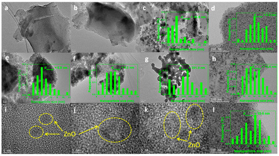 TEM images of (a) N-C; (b) 5ZnO-N-C; (c) 10ZnO-N-C; (d) 20ZnO-N-C; (e) 30ZnO-N-C; (f) 40ZnO-N-C; (g) ZnO; (h) 20ZnO-N-C-air; (l) spent 20ZnO-N-C catalyst (GHSV = 840 h−1, T = 580 °C, t = 6 h). HRTEM images of (i) 20ZnO-N-C; (j) 20ZnO-N-C-air; (k) spent 20ZnO-N-C catalyst (GHSV = 840 h−1, T = 580 °C, t = 6 h).