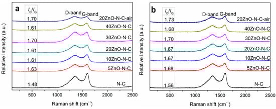 The Raman spectra of the catalysts were further analyzed and are described in Figure 3. No characteristic Raman bands of ZnO between 200 cm−1 and 600 cm−1 were observed on the catalysts, also suggesting that the ZnO nanoparticles were doped on the support [33]. However, all the catalysts exhibited the featured D band and G band at 1345 cm−1 and 1590 cm−1, which are attributed to the structural defect of the carbon atomic lattice and the in-plane stretching vibration of carbon atom sp2 hybridization [34,35]. The ID/IG values for Raman spectra were utilized to evaluate the graphitization of carbon-based materials, which are listed in Figure 3. In comparison with N-C, the introduction of ZnO caused the ID/IG value to slightly increase from 1.48 to 1.61–1.70, suggesting that ZnO destroyed the order of the carbon materials, thus resulting in the reduction in the graphitization degree of the carbon-based catalysts. With the further increase in ZnO content in the catalyst, the ID/IG value changed little, indicating that adjusting the ZnO content did not have a significant effect on the graphitization of the carbon materials.