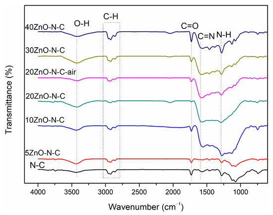 FTIR spectra were recorded to identify the types of functional groups on the catalysts, which are depicted in Figure 4. The figure shows that all catalysts with different ZnO contents display similarly shaped curves. The vibration of O–H located at the wavenumber of 3432 cm−1 was observed [36], indicating the presence of adsorbed H2O molecules on the catalyst surface, consistent with the following XPS results. The stretching vibrations located at about 2810–3010 cm−1 correspond to the C–H bond [34]. The peaks at 1580 cm−1 and 1280 cm−1 can be attributed to C=N bond and N–H bond [37], indicating that N-containing species were successfully retained in the catalyst. The intensive bands around 1726 cm−1 belong to the stretching vibrations of the C=O group, which is usually recognized as the active site of PDH on carbon-based materials [38,39]. However, the intensity of the C=O bond in the spectra of 20ZnO-N-C was the weakest among all the catalysts, indicating that C=O species may not have been the sole active site in the catalyst system for the PDH reaction.