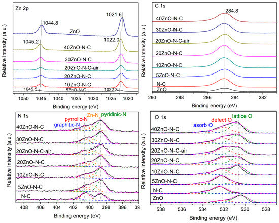 Furthermore, the XPS spectra of the catalysts, shown in Figure 5, were obtained to detect the elemental composition and chemical state of the species on the catalyst surface. The spectra revealed the presence of Zn, N, O, and C on xZnO-N-C catalyst’s surface, demonstrating that Zn species were successfully loaded, and N species were maintained in the materials. The two peaks located at 1021.6–1022.3 eV and 1044.8–1045.5 eV were assigned to the 2p3/2 and 2p1/2 electronic states of Zn2+, respectively [27]. The binding energy of Zn 2p for ZnO obviously shifted to higher direction in the xZnO-N-C and 20ZnO-N-C-air catalysts, indicating that the interactions between Zn species and the N-C support such as through Zn–Nx coordination bonds formed during the preparation process. Moreover, the intensity of the Zn 2p spectra strengthened for the xZnO-N-C catalyst with increasing ZnO content, demonstrating that the Zn content on the catalyst surface increased, as listed in Table 1. The N 1s spectra of the N-C was clearly split into three peaks at 398.6 eV, 400.6 eV, and 401.5 eV, which are associated with pyridinic-N, pyrrolic-N, and graphitic-N species, respectively [40]. However, the deconvoluted N 1s spectra of the xZnO-N-C and 20ZNO-N-C-air revealed that another type of nitrogen-based species Zn–Nx, located at 399.4 eV, was present [15]. Therefore, the results confirmed that Zn–Nx species formed in the carbon skeleton of xZnO-N-C. Moreover, 20ZnO-N-C exhibited a larger total amount of the three nitrogen-based species (5.71%) and surface Zn–Nx species (1.14%) than 20ZnO-N-C-air, which may have resulted from the more thorough condensation reaction that occurred under a vacuum compared with that in air. The O 1s signals of the catalysts exhibited three distinct peaks: lattice O (Olatt: 530.4–530.7 eV) or Zn–O from ZnO, O defect (Odef: 532.0–532.3 eV), or the O species of C=O group on the N-C support and adsorbing O (Oad: 533.4–533.7 eV), or adsorbed H2O molecules [41]. As shown in Table 1, the content of surface O species on 20ZnO-N-C was less than on 20ZnO-N-C-air, which we attributed to the C=O groups, suggesting that the C=O group was not the only active site for the PDH reaction, consistent with the FTIR results.