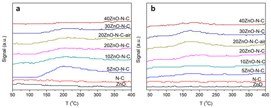 The acidity and basicity of a catalyst are important factors influencing its dehydrogenation activity and product selectivity [42]. Therefore, NH3-TPD and CO2-TPD characterizations were performed for each catalyst in order to detect their acidity and basicity, and the corresponding profiles are displayed in Figure 6. The peaks with weak intensities, located at 100–350 °C on the NH3-TPD and CO2-TPD profiles of the xZnO-N-C and 20ZnO-N-C-air catalysts, suggested the presence of tiny amounts of acidity and basicity [43]. Both ZnO and N-C materials are hardly acidic or basic. After ZnO loading, the materials exhibited increasing acidity and basicity, demonstrating that there were some interactions between Zn and N-C species, as proved by the Raman and XPS characterizations. Moreover, the acidity and basicity of xZnO-N-C varied for different ZnO loading amounts, suggesting that Zn loading can be utilized to adjust the acidic and basic sites of N-C-based materials.