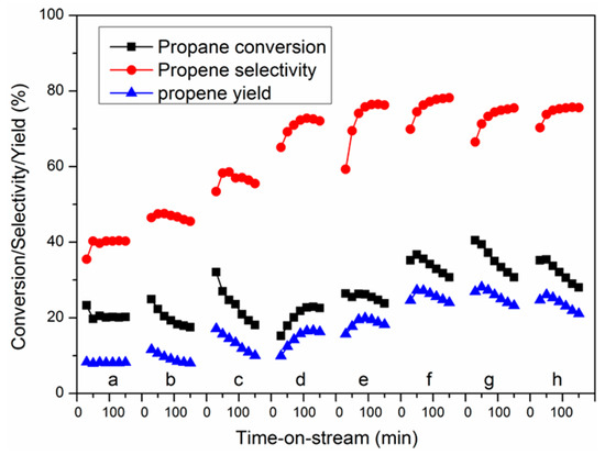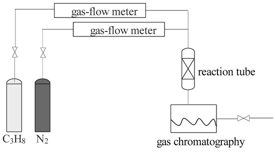 The direct dehydrogenation of propane to propene was carried out in a continuous-flow quartz reaction tube at atmospheric pressure, packed with 0.50 g of catalyst sample supported on 1.0 g of quartz sand (60–80 mesh) and placed in the constant-temperature zone of a reaction furnace, as depicted in Scheme 2. Propane gas (5.0–10.0 mL·min−1 flowing rate for 600–1200 h−1 of GHSV) was switched into the reactor after the reaction temperature reached the set value in N2 flow (20 mL·min−1). The outlet gas was analyzed using an online gas chromatography (GC2014, SHIMADZU, Tokyo, Japan) equipped with a hydrogen flame ionization detector packed with HP-AL/S capillary chromatographic column and a thermal conductivity detector provided with TDX-01 packed column, with a sampling interval of 20 min. The carbon balance for all reactions was stabilized within the range of 100 ± 4%. Moreover, the deactivation rate constant (kd, h−1) of the catalyst was calculated using the following formula: kd = (ln((1 − Xfinal)/Xfinal) − ln((1 − Xinitial)/Xinitial))/t, where Xinitial and Xfinal represent the conversion of propane on the catalyst before and after reaction (%), and t stands for the reaction time (h).