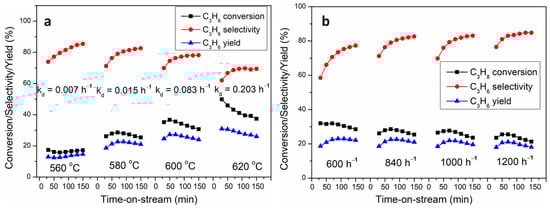 Then, the influences of reaction temperature (T) and gas hourly space velocity (GHSV) of propane for the 20ZnO-N-C catalyst on the PDH reaction were determined, as shown in Figure 8. As expected, propane conversion greatly increased and the propene selectivity of the catalyst gradually reduced as the reaction temperature increased from 560 °C to 620 °C based on the endothermic characteristic of the PDH reaction. Moreover, the kd value of 20ZnO-N-C increased, illustrating a decreasing catalytic stability with increasing reaction temperature. Also, as expected, the propane conversion of the catalyst gradually decreased, and the propene selectivity and catalytic stability increased as the GHSV of propane increased from 600 h−1 to 1200 h−1. This occurred because the reduction in the contact time prevented the occurrence of side reactions, therefore benefiting the propylene selectivity and thus the catalytic stability.