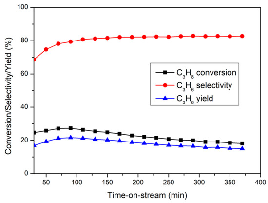 Finally, the catalytic stability of the 20ZnO-N-C catalyst at a reaction temperature of 580 °C and a GHSV of 840 h−1 was determined over 6 h, with the results presented in Figure 9. The initial propane conversion and propene selectivity were 24.6% and 68.6% for the catalyst, respectively. With the increase in the time-on-stream, propane conversion shows a slightly decreased trend with a very small kd value of 0.071 h−1. Nevertheless, the propene selectivity ascended, reached 83.0% after reaction for about 150 min, and then stabilized, demonstrating the high stability of the 20ZnO-N-C catalyst under reaction conditions of T = 580 °C and GHSV = 840 h−1.
