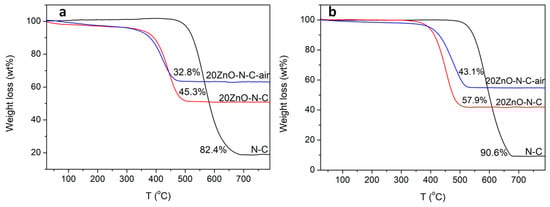 In order to investigate the amount of coke on the spent catalysts, the TG curves of the fresh and spent N-C, 20ZnO-N-C-air, and 20ZnO-N-C (T = 600 °C, GHSV = 840 h−1, t = 150 min) were recorded and are shown in Figure 10. The amount of coke was calculated using the weight loss between 300 °C and 700 °C. The amount of the deposited carbon for the N-C catalyst was 8.2 wt%. The 20ZnO-N-C-air catalyst deposited 10.3 wt% carbon. We found that the 20ZnO-N-C catalyst exhibited slightly more coke accumulation (12.6 wt%) than 20ZnO-N-C-air. In combination with the catalytic performance, the coke formation is one of the factors that resulted in the decrease in activity, but it was probably not the main factor for the ZnO-N-C catalyst during the reaction.