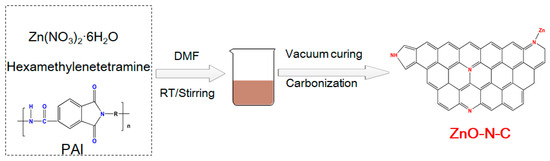 A series of xZnO-N-C catalysts (where x is the weight percent of ZnO in the catalyst precursor) were prepared with a vacuum curing–carbonization process, as shown in Scheme 1. Taking 20ZnO-N-C as an example, the specific synthetic process was as follows: A mass of 4.00 g of PAI (SR3602-37W, US Cymer, solid content 38%, viscosity 5000 cps) was firstly dissolved in 30 mL of N,N-dimethylformamide (DMF, Sinopharm Chemical Reagent Co., Ltd., Shanghai, China) to form a transparent solution. Then, 3.66 g of Zn(NO3)2·6H2O (Sinopharm Chemical Reagent Co., Ltd., Shanghai, China) and 1.00 g of hexamethylenetetramine (Sinopharm Chemical Reagent Co., Ltd., Shanghai, China) were added to obtain a homogeneous solution. This solution was then stirred at 150 °C to form a viscous solid and further cured under vacuum at 150 °C for 4 h to obtain the catalyst precursor. Finally, the precursor was carbonized at 500 °C for 2 h, then at 600 °C for 6 h in a N2 atmosphere at a ramping rate of 1.5 °C·min−1 to obtain the 20ZnO-N-C catalyst. The xZnO-N-C catalysts with ZnO weight percent of 5–40% were prepared following the process mentioned above by varying the added amount of PAI and Zn(NO3)2·6H2O, respectively.