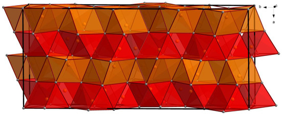 The sequence of alternating layers composed of perpendicularly oriented distorted trigonal prisms made of Ba atoms along the a-axis. Sb atoms are packed inside the Ba atom framework. The color code is the same as in Figure 1. Alternating slabs of perpendicular Ba6 prisms are denoted in red and orange. The unit cell is outlined.