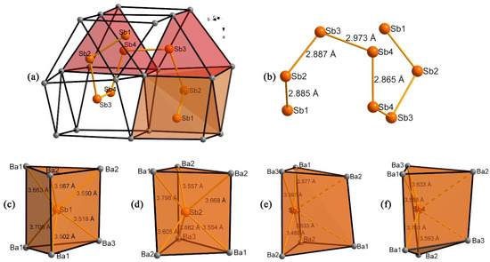 (a) The trigonal prismatic arrangement of Sb-centered [SbBa6] and empty [Ba6] polyhedra encasing the [Sb8]10− polyanion; (b) close-up view of the [Sb8]10− chain-like Zintl anion supplemented with the respective Sb–Sb distances; (c–f) distinct representation of Sb-centered trigonal prisms of Ba atoms. Sb1 and Sb2 atoms are located close to the center of the prisms, whereas Sb3 and Sb4 atoms are closer to one of the rectangular faces.