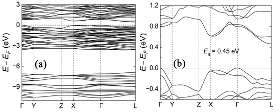 While the Zintl–Klemm formalism and considerations of electronegativity differences between Ba and Sb offer an empirical understanding of the bonding situation and predict semiconducting behavior [33], a more comprehensive insight into the electronic structure of the title compound was gained through our calculations. The results of the electronic structure calculations for Ba5Sb8 are presented in Figure 5, Figure 6 and Figure 7. According to Figure 5, the title phase is a semiconductor with a narrow, indirect bandgap of 0.45 eV. This value is in the range observed for multiple other Zintl antimonides, some of which are being tested for high-temperature thermoelectric energy conversion [34,35,36,37,38].