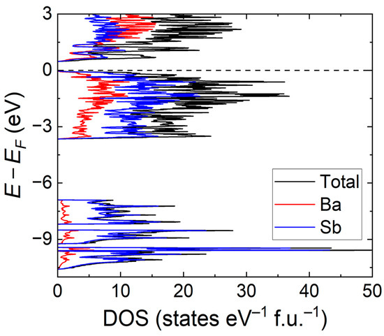 Density of states (DOS) curves are presented in Figure 6. The total (TDOS) and partial (PDOS) exhibit features are already observed in other Zintl antimonides, Ba16Sb11, in particular [11]. The largest contributors to the total DOS between −10.5 and −7.1 eV are Sb orbitals; the area close to the valence band maxima (VBM) in the region above −3.9 eV is also mainly contributed by Sb orbitals. The states that will be more crucial in influencing the electronic transport in Ba5Sb8 are those that are located in close vicinity of the Fermi level and are contributed by both Ba and Sb orbitals. This is indicative of their participation in Ba–Sb bonding, which is not entirely ionic in nature. In particular, the greater involvement of empty Ba-d orbitals shows that Ba atoms are not just electron donors. The involvement of Ba in covalent-like chemical bonding signals a deviation from the classic ionic approximation. This suggests that the pure Zintl reasoning that will treat the Ba atoms merely as a space-filling cation and electron donor does not fully capture the nature of the chemical bonding in this binary phase. Expectedly, a large contribution from empty Ba 5d orbitals dominate the region just above the Fermi level.