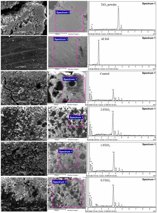 The SEM results offer crucial insights into surface morphology, particle characterization, and quality control, guiding research and development and correlating with material properties. Our SEM results related to self-cleaning modified acrylic paint tiles with varying TiO2 concentrations, presented in Figure 1 and Table 1, mainly indicate the presence of spherical particles. Table 1 provides the chemical composition from EDS spectra, aiding in understanding stoichiometry and impurity levels despite slight variations within the same sample, notably showing shifts in carbon, oxygen, calcium, and titanium percentages as TiO2 content increases. These variations suggest successful TiO2 incorporation, potentially influencing material properties like enhanced self-cleaning capabilities. TiO2 is the most commonly used pigment in paint formulations because of its high refractive index and brightness, excellent coverage, durability, whiteness, and opacity. Since the control sample was acrylic paint, it was expected to detect Ti in the control sample (Figure 1 and Table 1).