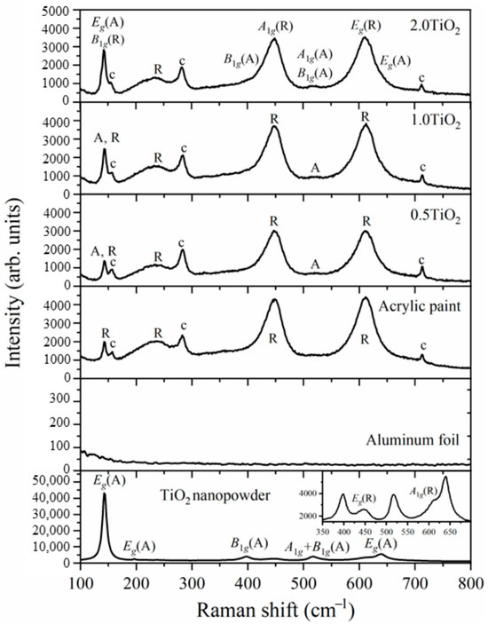 The Raman spectra of acrylic paint with different amounts of TiO2 nanopowder (Figure 3) are shown together with the spectra of TiO2 nanopowder, aluminum foil, and pure acrylic paint to investigate the influence of mixing acrylic paint with TiO2 nanopowder, application of these mixtures on aluminum foil, and subsequent heating/drying at 200 °C on characteristics of the samples.