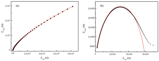 The complex impedance spectra for the coated foils with (a) acrylic paint and (b) 1.0TiO2-modified acrylic paint (black dots) fit with an equivalent circuit (red curve).