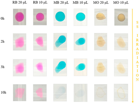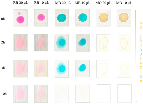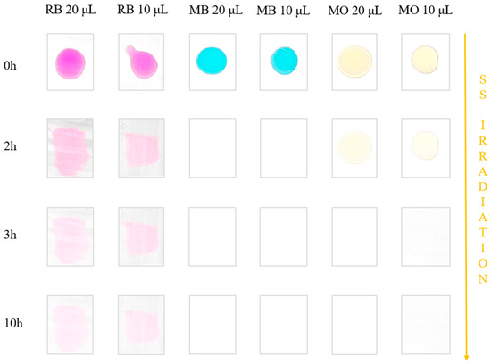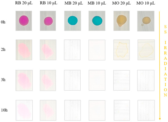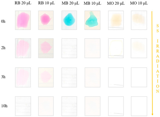 Upon SS irradiation, tiles containing 1.0TiO2 exhibited more efficient outcomes, requiring shorter irradiation durations for MB and MO dye removal. MO was removed within approximately 2 h, whereas MB necessitated 3 h. Despite this, traces of RB persisted on the tile surfaces after 10 h (Figure 15).