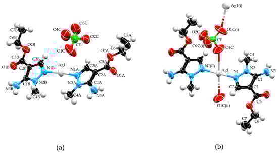 Silver(I) compounds are known as good antimicrobial agents [7,14]. The Ag(I) ion can also form coordination polymers with photocatalytic and photoluminescent properties [15,16]. In complex compounds, Ag(I) is often bicoordinated, but in coordination polymers, it forms three or four coordinative bonds. In considering the coordinative and biological properties of silver(I) ions and the good coordination ability of ethyl-5-amino-1-methyl-1H-pyrazole-4-carboxylate (L) and earlier results achieved with it [17,18], our group is focused on research related to L and its coordination complexes.