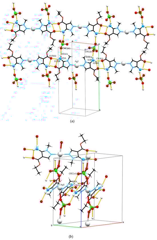 The asymmetric unit of 2 is constituted by half a unit each of Ag+ and perchlorate ion, situated in special positions, and one unit of L. Silver ion occupies a special position with site symmetry (inversion center) while a chlorine atom occupies a special position with site symmetry 2 (two-fold rotation axis). The organic ligand is coordinated in the same way as observed in 1. In contrast to the weaker coordination ability of the perchlorate anion, the distance between Ag1 and O1C (2.778(4) Å) in 2 is shorter than the distance between Ag1 and O1C found in 1 and can be considered as a coordination bond. Additionally, the Ag–O1C distance in 2 is comparable to those observed in structures with a square-planar AgN2(ClO4)2 fragment (CSD refcodes: LITBAT (d = 2.798 Å) [24] and CEZPUU (d = 2.819 Å) [25]). Therefore, in 2 perchlorate anion acts as bidentate coligand and had a bridging role connecting two silver atoms through O1C atoms, forming a monoperiodic polymer (Figure 2b). This rearrangement of atoms resulted in Ag+ ions situated in a square planar environment. Because N donor atoms of the ligand are inversion related, the angle N1–Ag1–N1(ii) has an ideal value of 180° while N1–Ag1–O1C and N1(ii)–Ag1–O1C have values of 94.51 (11)° and 85.49 (11)°, respectively, forming perfectly planar geometry.