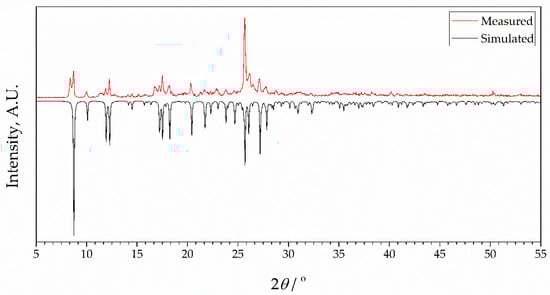 To check the phase purity of complexes, powder X-ray diffraction (PXRD) patterns of bulk samples of 1 and 2 were recorded at room temperature. Results are presented in Figure 3 and Figure 4, together with simulated diffractograms derived from crystal structures. A near-perfect agreement was observed in diffractograms for complex 2, indicating excellent phase purity of the compound. Conversely, the diffractogram of 1 exhibited additional peaks corresponding to an unidentified phase, implying the possible presence of unreacted species. This observation lends support to the idea that the inclusion of 4-formylbenzonitrile in the reaction mixture during the synthesis of complex 2 contributes to an enhanced crystallinity in the final product. It further confirms the aforementioned hypothesis that this compound acts as a modulator in the process.