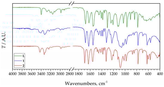 The IR spectra of 1 and 2, compared to the spectrum of the pure ligand show some differences (Figure 5). Since L is coordinated as a monodentate through the free N atom of the pyrazolic ring, differences between spectra are small and mostly result from different interactions in the crystal lattice of the new compounds. The most significant changes are observed between 3500 and 2800 cm−1 in the region of O–H, N–H, and C–H vibrations. The free ligand has bands between 3300 and 3100 cm−1, while in the spectra of 1 and 2 instead of them two partially overlapped strong bands somewhat above 3300 cm−1 are observed. Differently, the strong bands in the range 1700–1500 cm−1 in the spectra of the complexes are shifted toward lower wavenumbers compared to the spectrum of the L. Differences can be observed in the range 1300–1200 cm−1 also. Below 1200 cm−1 the bands of the ligand are shifted toward lower wavenumbers, but also the characteristic wide band of the perchlorate appears at ~1100 cm−1, thus it cannot be assigned with certainty. The main reason for this is that the wavenumbers of the split bands of ClO4− are very close to each other, and if some other bands, e.g., bands of organic ligands are detected at close wavenumbers, they are overlapping and difficult to assign split bands. Thus, the small band detected at 1123 cm−1, which looks like a result of splitting, can not with certainty be assigned to it because of the overlapping with the intensive bands of the ligand at 1125 and 1110 cm−1. It looks like the splitting of perchlorate, due to coordination, is not enough to separate into a triplet as can be expected due to the coordination of the perchlorate ion [26]. However, a similar situation was found in other silver perchlorate complexes [27,28,29]. On the other hand, the splitting of the characteristic perchlorate band at ~620 cm−1 may prove the different nature of the perchlorate group [30]. In the spectrum of 1, one intensive band at 619 cm−1 is detected, while in the spectrum of 2, two bands at 622 and 603 cm−1 were identified. In this range (below 700 cm−1), the spectra of the complexes are also different compared to the same range in the IR spectrum for L.