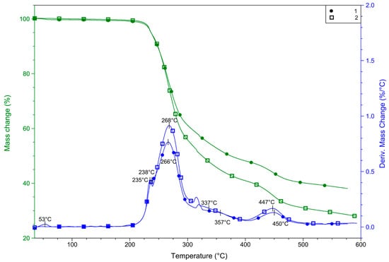 For complexes 1 and 2, with the same composition but differently oriented pyrazole moieties, it was interesting to determine if the orientation of the ligand affects the thermal properties of the compound, and if the polymer is more stable than the monomer complex. With this aim, measurements were carried out in both inert and oxidizing atmospheres. Firstly, a pre-experiment was performed in an inert atmosphere to determine the safest conditions for measurements considering the perchlorate content of 1 and 2. Both complexes were analyzed in nitrogen (Figure 6). Up to ~270 °C, the only significant difference between thermal curves (TG DTG, and DSC) is that 1 contains some solvent, most probably absorbed moisture, which evaporates somewhat above room temperature. This evaporation results in a mass loss of 0.4% and finished up to 60 °C. Compound 2 does not contain an absorbed solvent. Both compounds are stable up to relatively high temperatures. DTG curves suggest that above 180 °C, compound 1 begins to decompose in overlapped processes, but the differences in DTG and TG curves between 1 and 2 are very small. Above 200 °C, two partially overlapped DTG peaks are detected in both cases with maximums of 238 and 266 for 1 and 235 and 268 for 2, respectively. In this step, 1 lost 40.1% of its mass, but this step does not finish before the beginning of the next step, in which the mass loss is 11.6%. In the case of 2, these two steps overlapped more, therefore the overall mass loss was determined as 59.2% up to 400 °C. These mass loss steps may be correlated to the partial decomposition of pyrazole-type ligands (62.01% for two L molecules) and the decomposition of perchlorate. Above this temperature, one more step is observed in both cases, in which 1 loses 8.4% while 2 lost 10.7%. DTG maximums were 450 and 447 °C for 1 and 2, respectively.