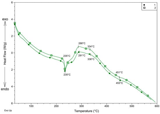 DSC curves (Figure 7) support the supposed decomposition. The beginning is endothermic, which is in accordance with the decomposition of the organic part of the complex. The sharp endothermic peak also suggests that the complex melts at the beginning of the decomposition. On the other hand, the endothermic peak turns into overlapped exothermic peaks above 260 °C. This exothermic effect suggests that perchlorate, which may easily generate the explosion of the compound, decomposes between 260 and 380 °C. The very low endothermic peaks at 453 °C for 1 and 451 °C for 2 suggest that during the decomposition process, AgCl also forms and melts at 455 °C [31].