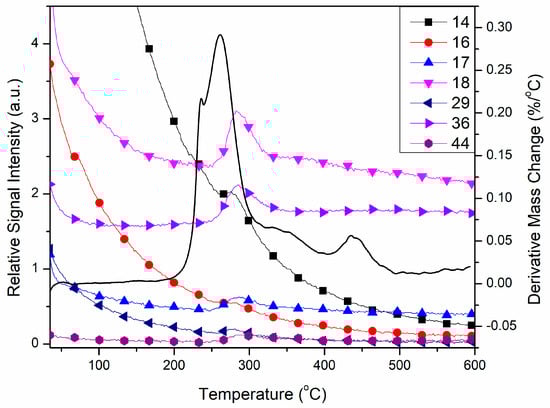 Online coupled TG-MS measurements showed that the slight mass loss from room temperature is a water loss process with peaks of 17 and 18 m/z, characteristic for water MS spectrum [32]. This result suggests that compound 1 slightly absorbs moisture from the atmosphere during storage. The intensive peaks at ~300 °C (Figure 8) prove that occurs the oxidative degradation of pyrazole-type ligands. Due to the presence of perchlorate, oxidation in an inert atmosphere is also possible and gives the characteristic fragments of oxidative decomposition of the organic fragments of the compound: 14 m/z for N+ or CH2+, 16 m/z for O+ or NH2+, 17 and 18 m/z are together characteristic for H2O+, besides, 17 also partially corresponds to NH3+ too [32]. The 29 fragment m/z most probably corresponds to NCH3+ or CH3CH2+, 36 m/z is usually the mass value of molecular ion HCl+, which would prove redox reactions between perchlorate and L, but also may correspond to the C3+ fragment of the organic ligand. The mass value 44 m/z may have corresponded to two different fragments, CO2+ or N2O+, which are both possible to get by oxidation of the pyrazole moiety.