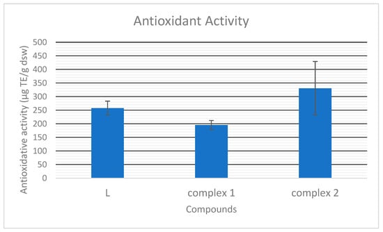 As presented in Figure 9, the antioxidative capacity of the pyrazole-type ligand is 257.76 μg Trollox equivalent per g of the dry sample mass. It is in range with the earlier determined antioxidative capacity of Zn complexes with L [18]. Compound 1, with pyrazole moieties oriented in the same way, shows somewhat lower activity than that of L (195.53 µg ek. TE/g.s.m), but polymer 2, with reverse-oriented pyrazole ligands, shows significantly higher antioxidative activity, 330.60 µg ek. TE/g.s.m. Considering the almost identical molar conductivity of compounds in N,N-dimethylformamide (DMF), they are most probably dissociated in the same way in both DMF and DMSO, used in antioxidative tests. Thus, in solution, the most probable ions are ClO4− and [AgL2]+ and the most significant difference between 1 and 2 is the orientation of L in their cations. Based on our earlier results [18], we concluded that most probably, the amino substituent of the pyrazole ring neutralizes the DPPH• radical. Taking it into account, most probably, differently oriented pyrazole rings in the complexes’ structure result in different hindrances and interactions of this group in the solutions of the compounds, therefore, in different free radical scavenging capacities.