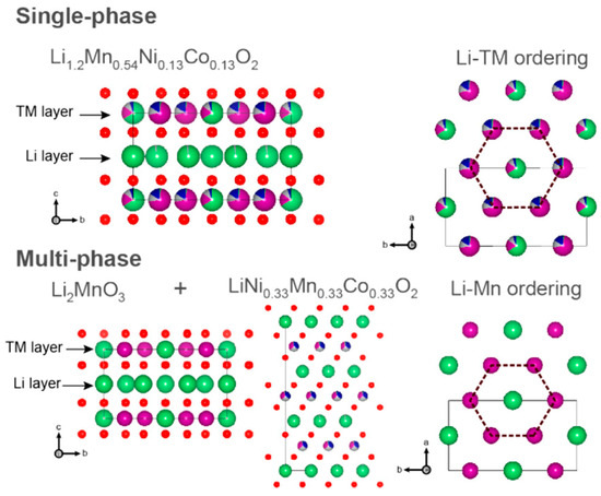 The crystal structure of LRM is challenging to identify due to the similarity and complexity of the crystal structures of LiMO2 (space group R-3m) and Li2MnO3 (space group C2/m) [72,73,74,75]. As shown in Figure 1, researchers have established single-phase solid solution and multi-phase composite models, respectively, for the existence of LiMO2 and Li2MnO3 phases in the form of layered single-phase solid solution [76,77,78,79] or multi-phase composite [61,80]. The main dispute between these models concerns the distribution of M atoms in the transition metal layer. Some researchers believe that M atoms are uniformly mixed in the transition metal site; the chemical formula can be written as Li1+xM1−xO2 (0 < x < 1). They base this on the linear relationship between the lattice constant of LRM and the proportion of LiMO2 and Li2MnO3 components, which follows Vegard’s law of solid solutions [81]. This is supported by transmission electron microscopy and electron diffraction results revealing single-phase solid solution type LRM with either C2/m [82] or R-3m space group [83,84]. Additionally, some researchers believe that there are separation and local clusters of M atoms in the transition metal layer, and the chemical formula can be written as xLi2MnO3·(1−x)LiMO2 (0 < x < 1), as evidenced by transmission electron microscopy and electron diffraction results that reveal the existence of multi phases and their heterointerfaces in LRM [85,86,87]. Although both models are supported by experimental evidence, the controversy persists because X-ray diffraction and electron diffraction results can be affected by stacking fault [88,89], preventing accurate determination of fine crystal structure information [82,90]. Moreover, transmission electron microscopy results are usually obtained only from the local lattice region. Therefore, to determine the crystal structure of LRM, further advanced characterization methods paired with computational simulations are still needed to comprehensively highlight the advantages of various methods and verify the reliability of evidence from all perspectives [74].