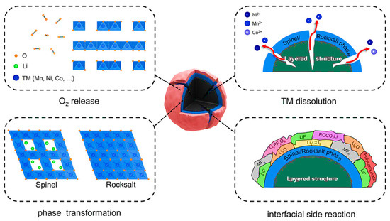 LRM exhibits high specific capacity due to the additional anionic redox activity. However, anionic redox reactions activated at high charging voltage can cause a series of problems (Figure 3), including irreversible oxygen release, surface/interface structural phase transitions, transition metal dissolution, and interfacial side reactions. These issues will destroy the crystal structure, block the lithium-ion diffusion pathway, and hinder charge transfer, thereby reducing the initial Coulombic efficiency (ICE), deteriorating the rate performance, and exacerbating the fading of capacity and voltage, which greatly limits the large-scale commercial viability of LRM [97,98,99].