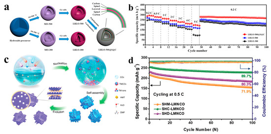 Morphology design primarily involves controlling the initial precursor morphology by adjusting preparation methods and process parameters during the precursor’s production. This ultimately leads to obtaining the desired final morphology through subsequent high-temperature sintering [119,120,121,122,123]. LRM exhibits a wide variety of morphologies, such as fusiform porous micro-nano structure [119], double-layer hollow microspheres [120], nanowires [121], irregular particles [122], and three-dimensional cube-maze-like structures [123]. To prepare double-layer LRM hollow microspheres, Ma et al. [120] employed the co-precipitation method to synthesize spherical transition metal hydroxide precursors. They then pre-calcined the precursors to form corresponding transition metal oxides, achieving a hollow structure in the spherical transition metal oxides by controlling the pre-calcination temperature. Mixing the transition metal oxide with lithium hydroxide and calcining at high temperatures resulted in the target morphology (Figure 4a). The synthesized double-layer LRM hollow microspheres enhanced structural stability and optimized lithium-ion diffusion paths and charge transport characteristics, leading to significant rate performance improvement (Figure 4b). Additionally, Liu et al. [123] used the hydrothermal method to prepare a three-dimensional cube-maze-like carbonate precursor by controlling the proportion of solvent components. They combined this approach with solid phase sintering to produce a three-dimensional cube-maze-like LRM with exposed {010} active planes (Figure 4c). The three-dimensional cube-maze-like architecture increases specific surface area and shortens lithium-ion diffusion paths, ultimately enhancing the rate capability and cycling stability of LRM (Figure 4d).
