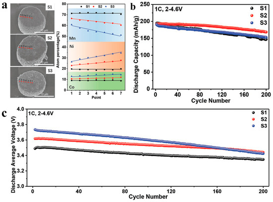 Phase composition and structure regulation primarily involve adjusting the component distribution and structural frameworks during both precursor and final LRM production [124,125,126,127,128,129,130,131,132]. Firstly, for phase component regulation, Wu et al. [124] synthesized agglomerated-sphere LRM with a concentration gradient in the phase component using the co-precipitation method. Figure 5a illustrates that Mn element concentration decreases linearly from the particle center to the surface, while Ni and Co element concentrations increase linearly. By combining high-capacity particle center and cycle-stable surface phases, voltage fading is effectively suppressed, and cycling stability is improved (Figure 5b, c). Secondly, for phase structure regulation, transition metal ions can migrate into lithium sites within the lithium layer relatively easily through tetrahedral sites between the transition metal layer and the lithium layer in conventional O3-type LRMs. This irreversible migration leads to structural rearrangement and voltage attenuation [125,126,127,128]. Eum et al. [128] used the ion exchange method to prepare O2-type LRM to inhibit this phenomenon. In the O2-type phase structure, face-shared transition metal ions generate strong electrostatic repulsion, preventing their transfer to lithium sites. Additionally, these face-shared sites promote reversible transition metal ion transfer back to the original sites in the transition metal layer during discharge. Finally, co-regulation of phase composition and structure can also be employed. For example, constructing the spinel/layered heterostructure [129,130,131,132] with good structural compatibility creates three-dimensional lithium-ion diffusion channels, enhances lattice oxygen stability, and restrains phase transitions and interfacial side reactions. This approach improves the rate and cyclic performance of LRM.