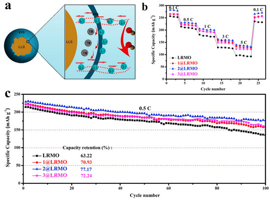 The rate performance of LRM is primarily limited by lithium-ion diffusion rates within the material and charge transfer rates at the electrode/electrolyte interface [105,106]. Among them, several factors contribute to limiting lithium-ion diffusion in LRM, which can be divided into three main categories. Firstly, during the charging process, lithium-ion in the transition layer of the Li2MnO3 phase must migrate to the lithium layer via stabilized tetrahedral sites, and the overall migration path is longer and the repulsion effect is relatively larger during the migration process compared to that of lithium-ion in the LiMO2 phase [107]. Meanwhile, the Li2MnO3 phase and its active MnO2 components exhibit poor kinetics, and the dynamic barrier of lithium-ion diffusion at the interface between the Li2MnO3 component and electrolytes is higher [105]. Secondly, the diffusion path of lithium-ion can only be along the direction parallel to the lithium layer, and the crystal face perpendicular to the lithium layer has no electrochemical activity for the transport of lithium-ion, preventing them from providing a suitable path for lithium-ion transport [108,109,110]. Thirdly, due to the poor electrical conductivity of the Li2MnO3 phase, LRM exhibits low electrical conductivity [105,106,111].