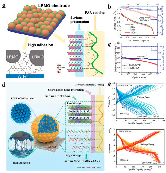 The primary purpose of binder research is to inhibit transition metal ion transfer and improve adhesion to LRM. In addition to commonly used polyvinylidene fluoride, other binders include polyacrylic acid and polyacrylonitrile [174,175]. For example, Yang et al. [174] employed polyacrylic acid as the binder (Figure 9a). This effectively isolated and mitigated electrolyte erosion on LRM. The hydrogen ions in polyacrylic acid can exchange with the lithium ions on the LRM surface, forming a proton-doped surface layer that hinders transition metal ion transfer. This process reduces voltage decay and enhances cycling stability (Figure 9b, c). Additionally, Xu et al. [175] used polyacrylonitrile as a binder (Figure 9d). The carbon–nitrogen triple-bond in polyacrylonitrile can form coordination bonds with unstable transition metal ions on the LRM surface. These bonds increase the migration energy barrier for irreversible transition metal ions transfer. Meanwhile, the coordination bond enhances the adhesion between polyacrylonitrile and LRM, reducing electrolyte erosion and improving adhesion to the aluminum foil current collector. This results in enhanced voltage and cycling stability (Figure 9e, f).