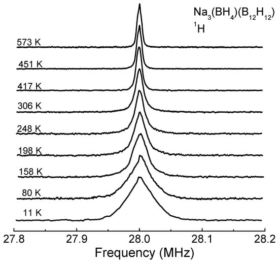 1H and 11B nuclear magnetic resonance results. The evolution of the 1H NMR spectra for Na3(BH4)(B12H12) with temperature is shown in Figure 2. The spectra exhibit a considerable narrowing with increasing temperature, which can be attributed to a partial averaging of dipole–dipole interactions of 1H spins due to the jump motion of H atoms. Figure 3 shows the temperature dependence of the 1H line width ΔH (full width at half-maximum). The line width at half-maximum has been obtained from the experimental NMR spectra without any attempts of fitting the line shape. Taking into account the typical signal-to-noise ratio, such a procedure gives an estimated error of ±5%. It should be noted that at high temperatures, ΔH does not drop to very small values, remaining on a plateau of approximately 10 kHz. This feature (typical of all the studied hydroborates [17,19,22]) indicates the localized nature of the motion of H atoms, as can be expected for anion reorientations. In contrast to the long-range translational diffusion, the localized motion leads to only a partial averaging of the dipole–dipole interactions between moving nuclear spins.