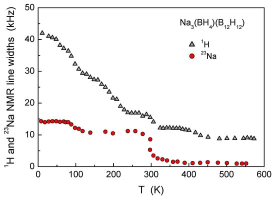 Temperature dependences of the width (full width at half-maximum) of the 1H NMR spectra measured at 28 MHz and 23Na NMR spectra measured at 23 MHz for Na3(BH4)(B12H12).
