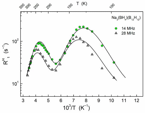 with the activation energy Eai for the ith type of motion, for each of the peaks, the plot of ln vs. T −1 is expected to be linear in the limits of both slow and fast motion with slopes of −Eai/kB and Eai/kB, respectively. The behavior of the proton spin-lattice relaxation rate shown in Figure 4 exhibits some deviations from the predictions of the standard theory. First, for both relaxation rate peaks, the high-T slope appears to be steeper than the low-T one. Second, at the low-T slope of each of the peaks, the frequency dependence of is weaker than the predicted ω−2 dependence. These features suggest the presence of a certain distribution of H jump rates [26]. The simplest approach to introducing such a distribution is using a Gaussian distribution of the activation energies [26]. The details of the two-peak model [27] used for the analysis of the proton spin-lattice relaxation data for Na3(BH4)(B12H12) are presented in the Supplementary Information. The model parameters are the average activation energies , the distribution widths (dispersions) ΔEai, the pre-exponential factors τ0i, and the amplitude factors ΔMi determined by the strength of the fluctuating part of dipole–dipole interaction between nuclear spins for the ith type of motion. These parameters have been varied to find the best fit of the model to the experimental data at two resonance frequencies simultaneously. The results of this simultaneous fit over the temperature range of 98–298 K are shown by black solid curves in Figure 4; the corresponding parameters are = 159(5) meV, ΔEa1 = 14(2) meV, τ01 = 5.9(3) × 10−15 s, ΔM1 = 8.2(2) × 109 s−2 (for the faster process of BH4 reorientations), and = 319(4) meV, ΔEa2 = 26(3) meV, τ02 = 1.2(2) × 10−15 s, ΔM2 = 3.8(2) × 109 s−2 (for the slower process of B12H12 reorientations). A comparison of these results with those obtained for K3(BH4)(B12H12) [16] indicates that the average activation energies for both reorientational processes in Na3(BH4)(B12H12) are considerably lower than the corresponding activation energies in K3(BH4)(B12H12) (236 meV for BH4 reorientations and 594 meV for B12H12 reorientations [16]). This is consistent with the higher reorientational mobility of both anions in Na3(BH4)(B12H12).