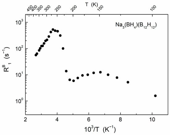 As can be seen from Figure 5, exhibits two peaks in the same temperature ranges as the corresponding peaks. On the basis of the observed amplitudes of the peaks, we can conclude that the low-temperature peak originates from BH4 reorientations, and the high-temperature one is due to B12H12 reorientations. Note that the 1H and 11B relaxation results resemble those found for K3(BH4)(B12H12) [16]; however, the relaxation-rate peaks for the Na-based system (near 240 K and near 130 K) are shifted to considerably lower temperatures with respect to those of the K-based system (near 390 K and near 200 K, respectively [16]). These results indicate the higher reorientational mobility of both [BH4]− and [B12H12]2− anions in the Na-based compound. Such a difference may be related to the smaller size of Na+ cations.