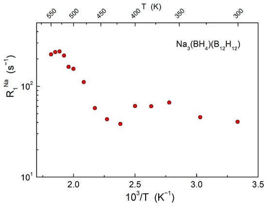 As can be seen from this figure, above 420 K, exhibits a significant increase, reaching a maximum near 530 K. The measured values in the region of the maximum are much higher than those expected for the 23Na—1H dipole–dipole interaction; therefore, the 23Na spin-lattice relaxation is dominated by fluctuations of the quadrupole interaction resulting from Na+ jumps. This is a typical feature of all the studied sodium hydroborates [5,17,22]. At the temperature of the maximum, the Na+ jump rate is expected to be nearly equal to the resonance frequency, i.e., (530 K) ≈ 8 × 108 s−1. The activation energy for Na+ diffusion estimated from the slope of the peak is 390(15) meV. For comparison, the activation energy derived from the ionic conductivity data in the range of 273–468 K is 340 meV [15].