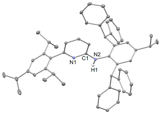 Although closely related to amidinates, aminopyridinate ligands, [(C5R4N)NR-2]−, have rarely been used to stabilize low-oxidation-state main-group compounds. This is perhaps surprising, considering that this ligand class has been widely applied in the preparation of low-oxidation-state d- and f-block metal compounds. These compounds, and their “normal” oxidation-state counterparts, have found numerous applications in synthesis, catalysis, and materials chemistry [13,14,15]. In order to stabilize low-oxidation-state d-block compounds, a variety of bulky aminopyridinate ligands have been developed, primarily from the group of Kempe [15,16]. These typically have bulky aryl groups installed at the amino N-centre and at the 6-position of the pyridine. As far as we are aware, the bulkiest of such aminopyridinates is I (Figure 1), which is substituted by Trip (2,4,6-triisopropylphenyl) and Dip (2,6-diisopropylphenyl) groups [16]. Its complexes can exhibit a degree of electronic delocalization over the NCN fragment, as is the case for related amidinate ligands. In this study, we report the synthesis of a series of aminopyridinate ligands that are significantly bulkier than I. We also describe the synthesis of a range of groups 1 and 2 metal complexes that have potential as reagents or precursors for the preparation of low-oxidation-state metal complexes.