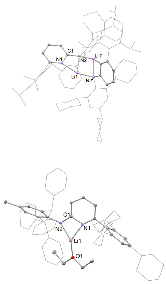 The solution-state NMR spectra for compounds 1–4 are reminiscent of their solid-state structures, which, for 1 and 4, are depicted in Figure 3. Compounds 2 and 3 are structurally analogous to 4, so their molecular structures can be found in the Supporting Information. Relevant metrical parameters for all the Li aminopyridinate complexes are compiled in Table 1. As alluded to above, compound 1 is a dimer which associates through N-centres which bridge three-coordinate N,N-chelated Li atoms that exhibit heavily distorted T-shaped geometries. Related structurally characterized dimeric Li aminopyridinates have been previously reported, but only where the aminopyridinate ligand is less bulky and the Li atoms are further coordinated by Lewis bases, e.g., as in [{(C5H3N-6-Me)N(SiMe3)Li(OEt2)}2] [17]. Compounds 2–4 are monomeric, with the Li atoms N,N-chelated by the aminopyridinate ligand, while additionally being ligated by a molecule of diethyl ether. This gives rise to a distorted trigonal planar geometry for the metal in each case. A lithium complex of aminopyridinate I, viz. [Li(κ2-N,N-I)(OEt2)], has been reported to have an analogous monomeric structure [16]. In all complexes 1–4, the Li-Namide and Li-Npy distances are similar, while the Cpy-Namide distance is shorter than that for a normal single bond. This is suggestive of a degree of electronic delocalization over the NCN fragment, as has been described for other Li aminopyridinate compounds, e.g., [Li(κ2-N,N-I)(OEt2)] [16].