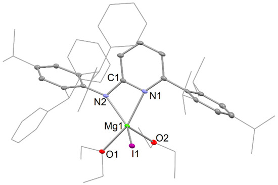 The solution-state NMR spectroscopic data for 5 reflect its structure in the solid state. The molecular structure of the compound (Figure 4) shows it to be monomeric, with the Mg centre being chelated by the aminopyridinate ligand, while also being ligated by two diethyl ether molecules. The distorted trigonal bipyramidal coordination sphere is completed by a terminal iodide. It should be noted that, although the final r-factors for the crystal structure are acceptable, the reflection data completeness is low (84.2% to a resolution of 0.833 Å; Cu Kα radiation; see Table S1). This arises due to the crystal of the compound slowly decomposing during the X-ray data collection. Despite this, the molecular connectivity of the molecule is unambiguous. There are only three previously structurally characterized aminopyridinato magnesium halides, and none of those are ether-coordinated monomers [19,20]. An examination of the N-Mg and Cpy-Namide distances in the compound indicate that, like in 1–4, there is a degree of delocalization over the NCN moiety, but this is seemingly less than in those lithium complexes.