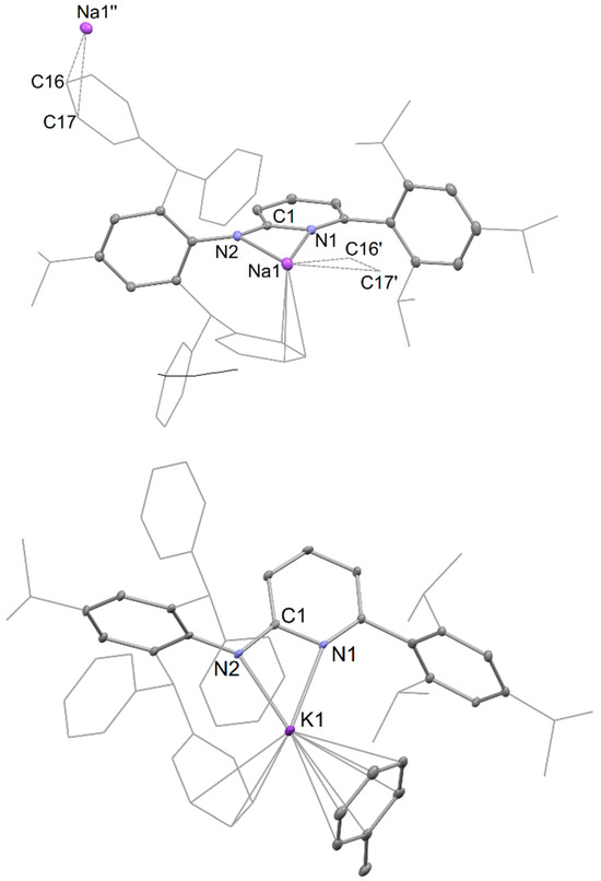 Molecular structures of the monomer unit of compound 6 (top), and compound 8 (bottom) (25% thermal ellipsoids are shown; hydrogen atoms omitted; isopropyl, and C(H)Ph2 groups shown as wireframe for clarity). Selected bond lengths (Å) and angles (°) for 6: Na(1)-N(2) 2.299(2), Na(1)-N(1) 2.4254(19), N(1)-C(1) 1.380(3), C(1)-N(2) 1.329(3), Na(1)-C(16)’ 2.828(3), Na(1)-C(17)’ 3.014(3), N(2)-Na(1)-N(1) 57.65(7), N(2)-C(1)-N(1) 114.66(19). Selected bond lengths (Å) and angles (°) for 8: K(1)-N(2) 2.612(4), K(1)-N(1) 2.777(4), N(1)-C(1) 1.393(6), C(1)-N(2) 1.321(6), K(1)-toluene cent. 2.988(5), N(2)-K(1)-N(1) 50.41(11), N(2)-C(1)-N(1) 115.8(4).