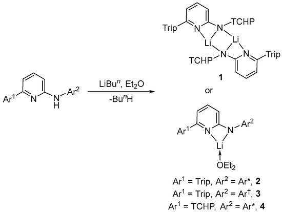 To assess the possibility of deprotonating the aminopyridines, ether solutions of the HAmPy1−4 compounds were treated with LiBun at 0 °C, then the reaction solutions were warmed to room temperature. The removal of volatiles in vacuo, followed by the recrystallization of the residues from hexane, afforded the lithium aminopyridinates 1–4 in high isolated yields as colourless crystalline solids (Scheme 2). Interestingly, compounds 2–4 are ether-coordinated monomers, while compound 1 is an amido N-bridged dimer. It seems likely that these differences arise from the seemingly lower steric bulk of the aminopyridinate ligand in 1, compared to those in 2–4. Despite these differences, compounds 1–4 all have the potential to act as ligand transfer reagents in salt metathesis reactions with main-group metal halide complexes. This is a typical pathway to β-diketiminato, amidinato, and guanidinato main-group metal halide complexes, which can act as precursors to low-oxidation-state systems via reduction processes [1,2,3,4,5,6,7,8,9].