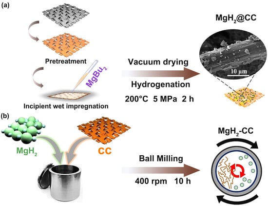 Schematic illustration of preparation process of (a) MgH2@CC and (b) MgH2-CC.