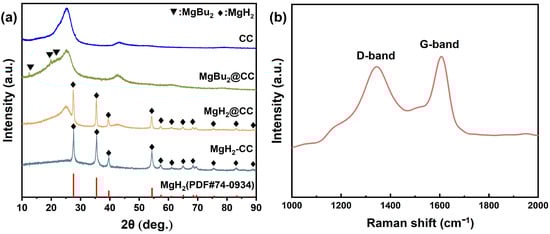 (a) XRD patterns of MgH2@CC and MgH2-CC composites and (b) Raman pattern of MgH2-CC composites.