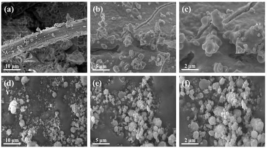 The microstructure of MgH2@CC composites obtained by hydrogenolysis of organic magnesium was observed by scanning electron microscopy and is shown in Figure 3a–c. It can be clearly observed that the MgH2 particles are uniformly distributed on the surface of the carbon fibers, and the high-density defects on the surface of the carbon cloth provide the growth sites for MgH2, which grows along the direction of the rod-shaped carbon fibers. It was also observed that some of the MgH2 on the surface of the carbon fibers was deposited due to physical changes during the impregnation process, but the MgH2 particles on the surface still showed a diffuse distribution. The microstructure of MgH2-CC composites obtained by ball milling is shown in Figure 3d–f. It can be clearly seen in the image that the MgH2 particles and carbon fibers are diffusely distributed on the surface of the conductive adhesive, and the particles do not show an obvious aggregation phenomenon. Compared with MgH2@CC composites, the particles are more uniformly dispersed, and it is easier to form a uniform carbon fiber loading system by the ball milling method, while the dispersed carbon after ball milling can inhibit the agglomeration of MgH2 particles.