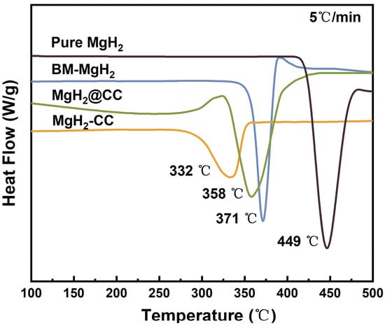 DSC curves of pure MgH2, BM-MgH2, MgH2@CC and MgH2-CC.