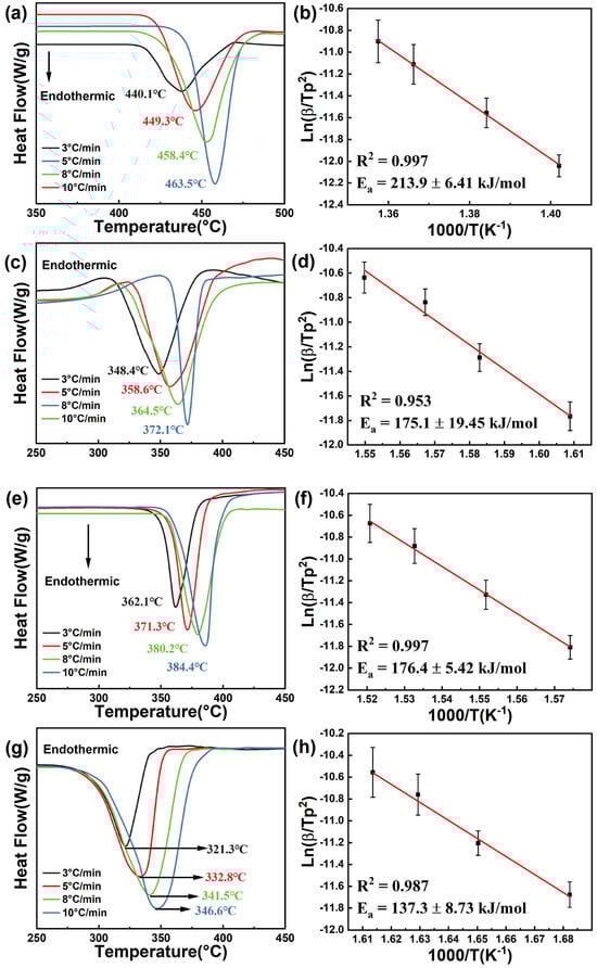 DSC curves and Arrhenius equation of (a,b) pure MgH2, (c,d) MgH2@CC, (e,f) BM-MgH2 and (g,h) MgH2-CC.
