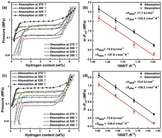 To investigate the thermodynamic properties of MgH2@CC and MgH2-CC composites, as shown in Figure 6a–d, P-C-T tests were performed at 275 °C, 300 °C, 325 °C, and 350 °C, and the hydrogen absorption and release plateau pressures were obtained for the corresponding temperatures. The plateau pressures (Peq) at different temperatures are shown in Table 1, and each plateau pressure is positively correlated with the temperature; ∆H and ∆S were calculated according to the Van’t Hoff Equation (3). Based on the slope and intercept of the straight line in the fitting results, the enthalpy changes of hydrogen release (∆Hdes) and entropy change of hydrogen release (∆Sdes) of MgH2@CC composites are 73.5 kJ·mol−1 and 140.5 J·mol−1·K−1, respectively, and the enthalpy change of hydrogen absorption (∆Habs) and entropy change of hydrogen absorption (∆Sabs) were −71.7 kJ·mol−1 and −132.2 J·mol−1·K−1, respectively. The enthalpy changes of hydrogen release ∆Hdes and entropy change of hydrogen release ∆Sdes of MgH2-CC composites were 73.0 kJ·mol−1 and 140.5 J·mol−1·K−1, respectively, and the enthalpy change of hydrogen absorption ∆Habs and entropy change of hydrogen absorption ∆Sabs were −72.8 kJ·mol−1 and −136.2 J·mol−1·K−1, respectively. Compared with the commercially pure MgH2 (∆Hdes = 76 kJ/mol−1 and ∆Sdes = 134.1 J·mol−1·K−1), the thermodynamic properties have not been improved, indicating that reducing the size of the MgH2 particle size and preventing MgH2 particle aggregation is more likely to be reflected in the improvement of kinetic properties.