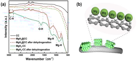 (a) FTIR images of MgH2@CC composite and MgH2-CC composites and (b) Schematic diagram of the enhanced mechanism for desorption of magnesium-carbon composites.