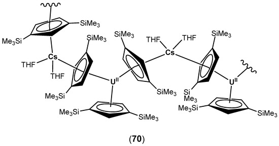 Polymeric structure of [(η5-Cp″)UII(μ:η5, η5-Cp″)2Cs(THF)2]n (70).